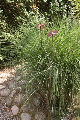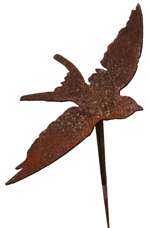 Låt en svala i rostig plåt sväva över rabbatten. Svalan finns i två storlekar. Den mindre modellen är 15 cm bred och den större modellen är 20 cm bred. Svalan är fäst på ett rundjärn som är 110 cm högt. Svalan är rostfärgad och rostar naturligt ute i trädgården.